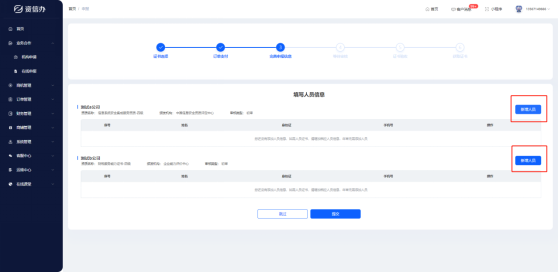 6、新增人员信息(可选择跳过此步骤)。如果申报企业需要人员证书,可通过点击此页面右上角“新增人员”按钮,添加人员相关信息。可添加多个。如申报企业没有人员证书需求,或者您办理的是年审业务,直接点击“跳过”按钮,进入下一步骤。