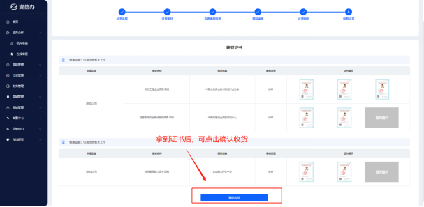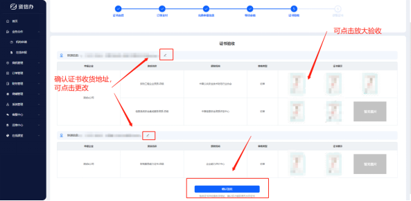 9、进行证书验收。审核通过后,您将需要确认证书收件地址是否正确,可点击修改。证书样本可点击放大查看。点击“确认验收”按钮后,才能得到无水印证书。
