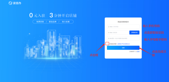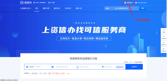 ①打开资信办官网(www.zixinban.com),点击右上角“商家登录”,进入注册界面。