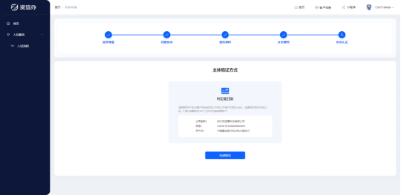 7、进行实名认证。若未选择线下支付方式,需要进行对公打款验证。请使用开户名为签约公司的对公户向指定账户打款指定金额,此费用仅用于实名认证,打款金额将在10个工作日内退回原账户。完成打款后,点击下方“完成验证”按钮。