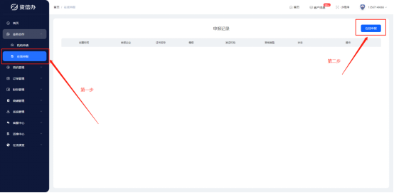 1、通过点击左侧菜单栏“业务合作”-“在线申报”,进入在线申报页面。点击右上角“在线申报”按钮,添加申报内容。