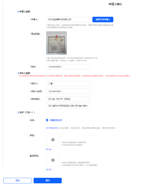 ③在“申请人确认”板块,若申请人信息已提交过,可在此页面点击“选择已有申请人”,信息填充后可编辑;若为新增申请人时,需要上传申请人的营业执照(营业执照上传后会自动识别填充申请人名称、联系人、详细地址,如识别错误可手动修改相关内容)、申请人注册手机号、联系人、联系电话、申请人所在省市区及收件详细地址。合同必须至少选择一个,选定后点击“提交”按钮。提交时为选择纸质合同,操作同CRM,合同下载及上传由财务及商务操作,若需要合同样本,可在此页面除营业执照及证书原件外信息补充完整的前提下,点击“下载纸质合同”,即可获得合同样本一份。如果选择声明或复用声明,需对接申请人填写日期并加盖公章后扫描上传。声明仅此次针对此次申请有效,复用声明五年内可复用。